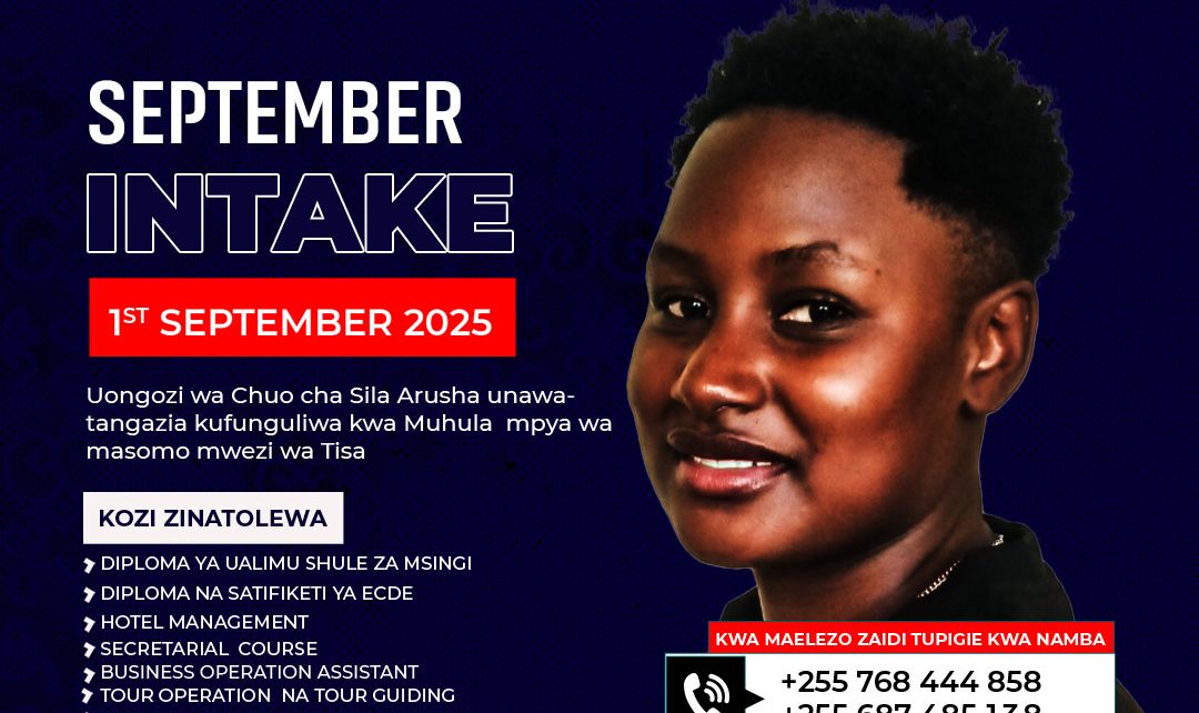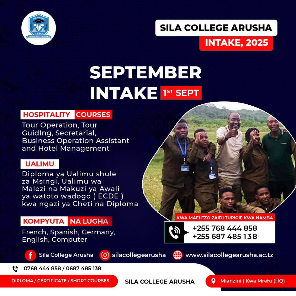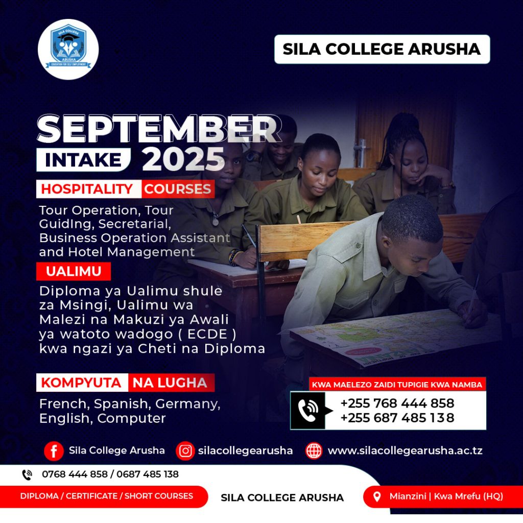 Chuo Cha Sila Arusha, kinapenda kuwatangazia kufunguliwa Kwa Dirisha la usajili Kwa Mwezi wa Tisa almaarufu kama (SEPTEMBER INTAKE) nyote mnakaribishwa kujiunga na kozi mbalimbali zinazotolewa chuoni.