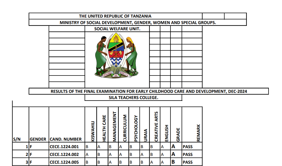 Chuo cha Ualimu Sila Arusha kinapenda kuwatangazia wanachuo wote matokeo ya mtihani wa utimilifu malezi na makuzi ya awali ya mtoto ngazi ya cheti uliofanyika December 2024. Matokeo haya yanapatikana kwa ajili yako kwenye tovuti yetu.